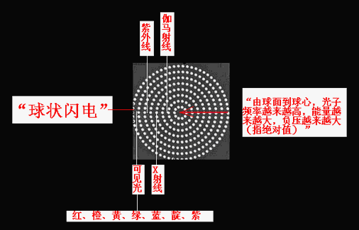 “棒電極”在球心對“球冠電極”“超短時間內(nèi)的高能”充電、放電,可以產(chǎn)生“球狀閃電”,其機理為:“雙向激擊”、“球冠振蕩”。因為“球冠振蕩”的頻率的不同,“球狀閃電”內(nèi)部呈現(xiàn)“嵌套球狀”,由外向里頻率由小到大,在可見光波段由外向里顯現(xiàn)為紅、橙、黃、綠、藍(lán)、靛、紫,而由外向里看,因疊加合成呈現(xiàn)白色,但是,當(dāng)最外面的頻率較小時,也可能是黃色或綠色或藍(lán)色的;一個大“光球”,可以分離為兩個或幾個小“光球”,但其顏色將會“變深”。[3][4]
