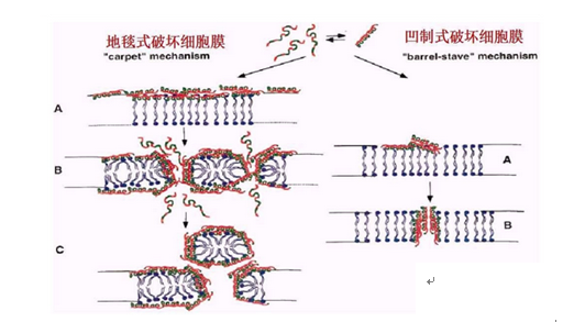 防御素抗菌的作用機理,目前有兩種不同的抗菌作用機理被提出,一種是獨立膜機制,另一種是防御素結合細胞內復合物的機制。獨立膜機制的觀點認為, 帶正電荷的防御素與帶負電荷的細菌細胞膜相互吸引,并相互結合,從而破壞了磷脂雙分子層的完整性,引起靶細胞膜出現裂隙??煞譃槿齻€階段:(1)由靜電吸引。防御素與靶細胞膜結合。防御素帶正電荷,可通過靜電作用與帶負電荷的細菌膜脂層結合;(2)通道形成。帶正電荷的防御素分子或其多聚體則與細菌質膜上帶負電荷的磷脂頭部和水分子相互作用,顯著地增加生物膜的通透性。防御素作用于膜上形成穩定的多個通道;(3)內容物外泄。通道形成后,防御素進入細胞內的同時,其他胞外分子也伴隨進入(如肽、蛋白質或無機離子),而靶細胞的重要物質(如鹽離子和大分子)滲出,細胞膜的通透性及細胞能量狀態受到了破壞,導致細胞膜去極化,呼吸作用受到抑制以及細胞ATP含量下降, 離子和大分子物質通過細菌的細胞膜, 最終導致靶細胞死亡。