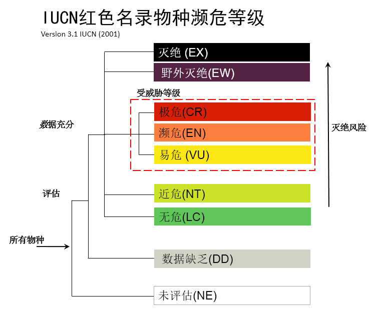 IUCN自20世紀(jì)60年代成立之日起,就設(shè)立了物種生存委員會(huì)(SSC),開始編制和印刷《IUCN瀕危物種紅皮書》,后來(lái)隨著評(píng)估物種的增加,印刷版逐步發(fā)展為網(wǎng)絡(luò)版的《IUCN瀕危物種紅色名錄》,定期編制發(fā)布。IUCN/SSC研究制定了《IUCN物種紅色名錄瀕危等級(jí)和標(biāo)準(zhǔn)》,根據(jù)物種的種群數(shù)量和分布情況等,評(píng)估其生存狀況,確定其瀕危等級(jí)。IUCN瀕危物種等級(jí)標(biāo)準(zhǔn)分為“有評(píng)估數(shù)據(jù)”和“數(shù)據(jù)缺乏”兩類,“有數(shù)據(jù)評(píng)估”中又分為“滅絕”、“野外滅絕”、“區(qū)域滅絕”、“極危”、“瀕危”、“易?!?、“近?!焙汀盁o(wú)?!钡?個(gè)級(jí)別,從“無(wú)危”到“極?!?,滅絕風(fēng)險(xiǎn)逐步上升,瀕危等級(jí)逐步增加。瀕危等級(jí)標(biāo)準(zhǔn)有5個(gè)指標(biāo),分別是種群下降、有限地理分布區(qū)、下降小種群、非常小或非常有限的種群、以及模型模擬等量化分析,根據(jù)這些指標(biāo)的數(shù)量閾值,來(lái)評(píng)估物種的瀕危等級(jí)。