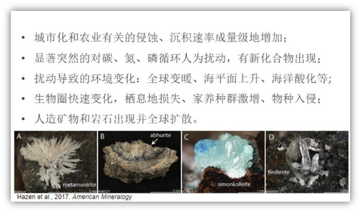 國際地層委員會的人類世工作組工作了10年,總結(jié)了一些現(xiàn)象,如城市化和農(nóng)業(yè)的侵蝕、沉積速率成量級地增加,顯著而突然的對碳、氮、磷循環(huán)的人為擾動,產(chǎn)生一些新的化合物,使得生物圈出現(xiàn)快速變化、棲息地的損失帶來植物多樣性的降低、馴化生物種群大規(guī)模增加,人類的遷徙活動等等。