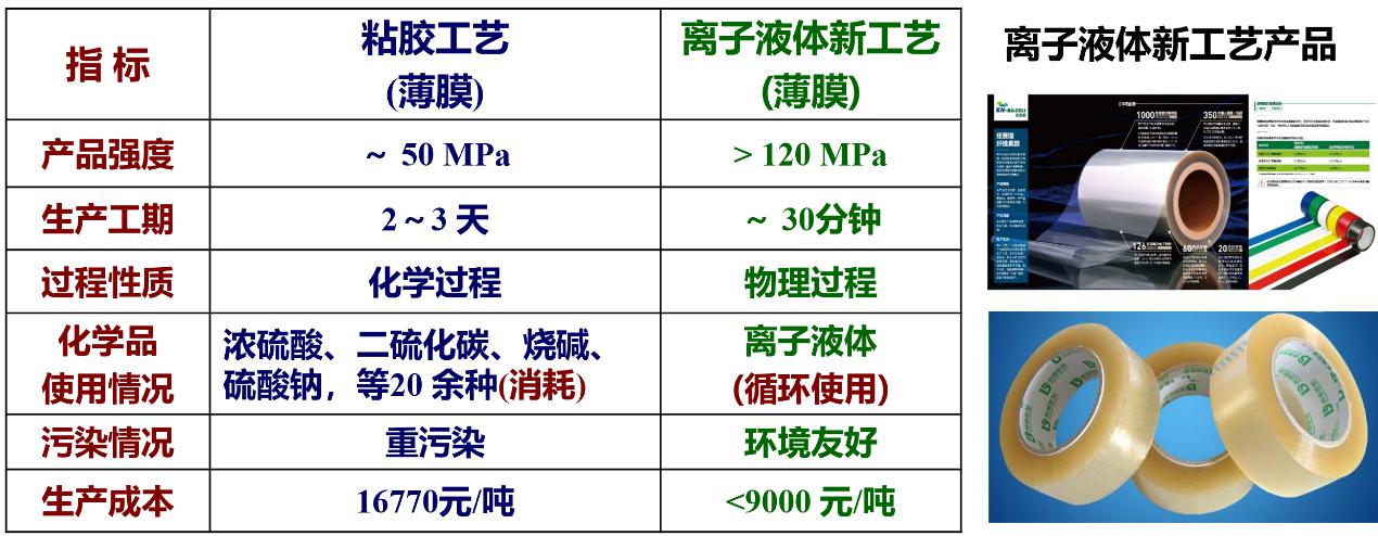 以前纖維素制膜工藝污染很大,中國逐漸在關停。而我們的離子液體工藝是物理溶解,基本沒有污染。原來工藝需要三天時間,現在三十分鐘就做出來了(圖8)。在車間里面都聞不到氣味,火都點不著,非常安全。其中溶劑是我們的專利,包括后面的溶劑回收,溶劑是可以回收再反復利用的。用我們這個工藝與企業合作建立了生產線,2019年基本已經建成了,今年11月底試車。生產的產品推薦在快遞物流上使用,特別是用低成本秸稈做的膠帶,有很好的應用前景。